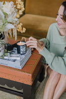 Our small-batch, non-toxic, vegan, phthalate-free soy wax candle features a custom scent blend of cashmere, plum, amber, blood orange, and sandalwood– and a cotton wick. The scent is cozy and sensual, but not overpowering– and evokes the allure and energy of Fall in the city.